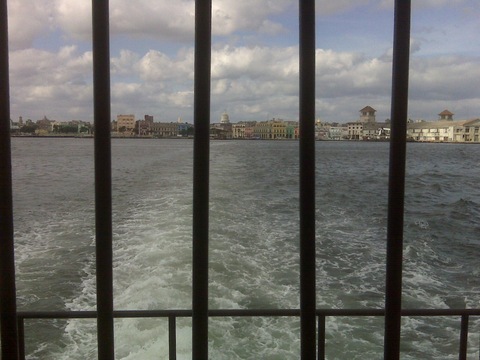 Photo I took of on a boat looking back on Havana. The bars preventing jumping off the ferry symbolized a city held hostage.